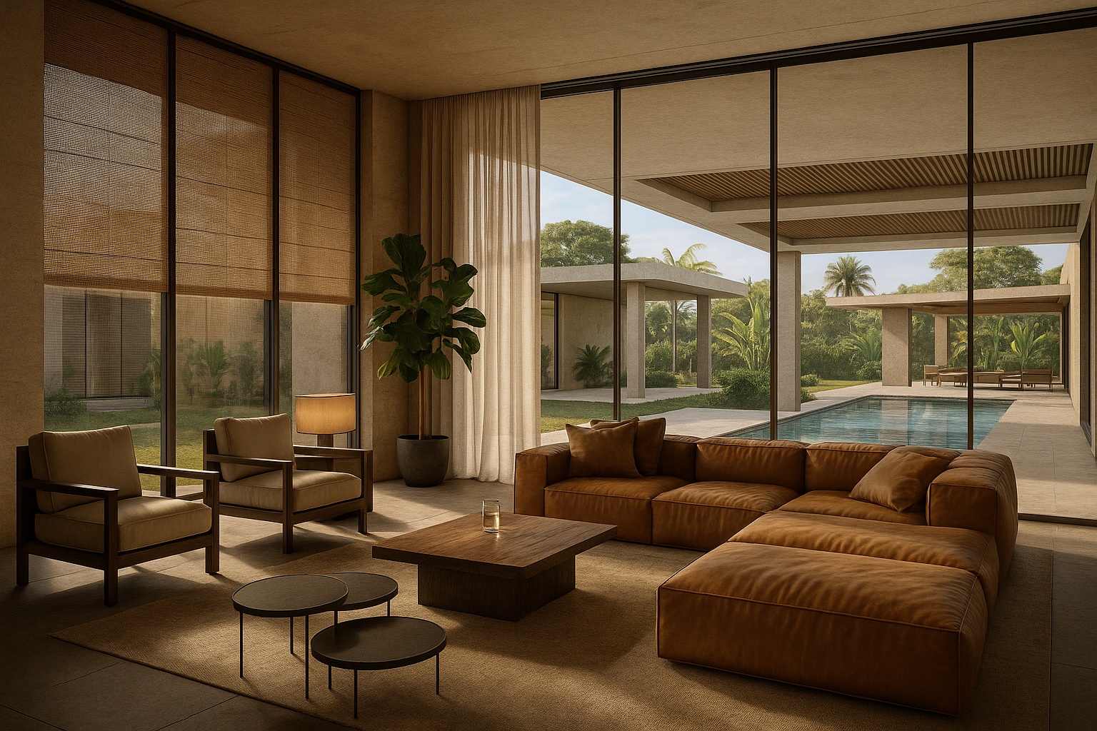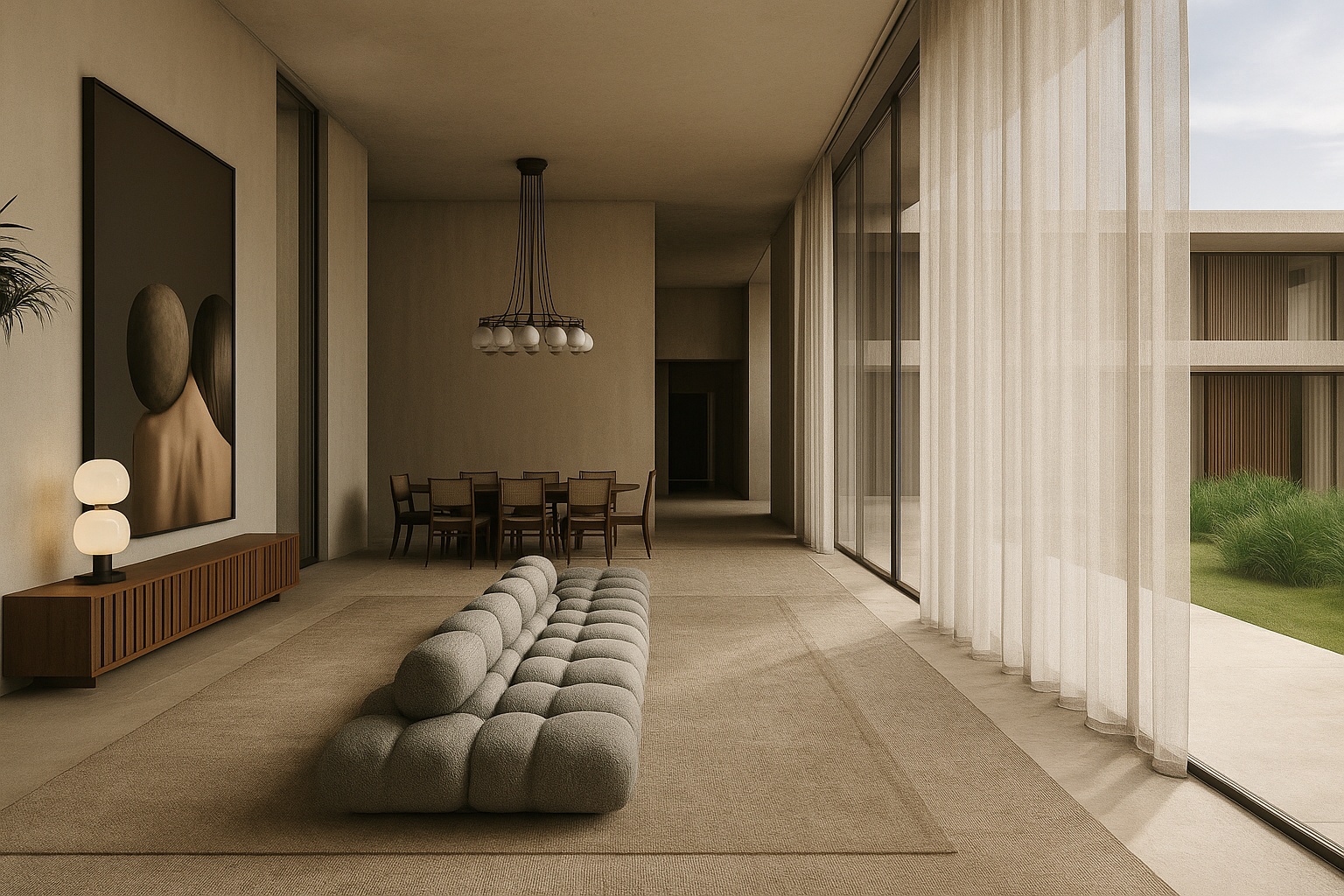 Le grandi vetrate creano una connessione fluida tra interni ed esterni, permettendo alla luce naturale di penetrare in profondità e aprendo scorci continui sul paesaggio. La distribuzione degli spazi è stata studiata per favorire una percezione di armonia, con linee architettoniche essenziali che dialogano con giardini interni, patii e aree verdi ricavate nella forma stessa della casa.